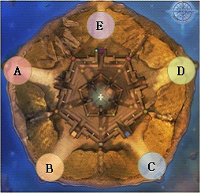 (Não é possivel atravessar de um ponto ao outro sem passar por dentro do castelo, mesmo aparentando haver uma passagem entre os pontos, essas passagens são fechadas) No ponto E existe um teletransportador que dá acesso a qualquer portão do castelo, podendo facilmente sair do portão do ponto E para o portão do ponto C por exemplo. Quando seu personagem morre, ele ressuscita de volta para o ponto E.